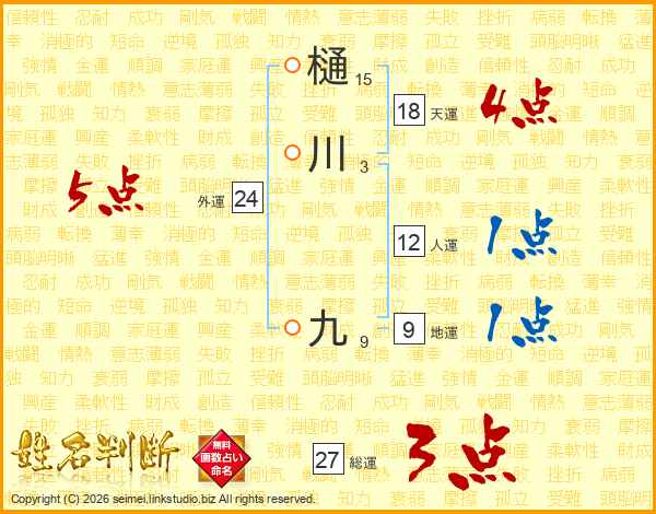 生活面を象徴する運勢です。外部から受ける影響力を表し、結婚運、家庭運や職場、環境への順応性を表します。総運から人運を引いた画数。姓や名が1文字の場合を除く。