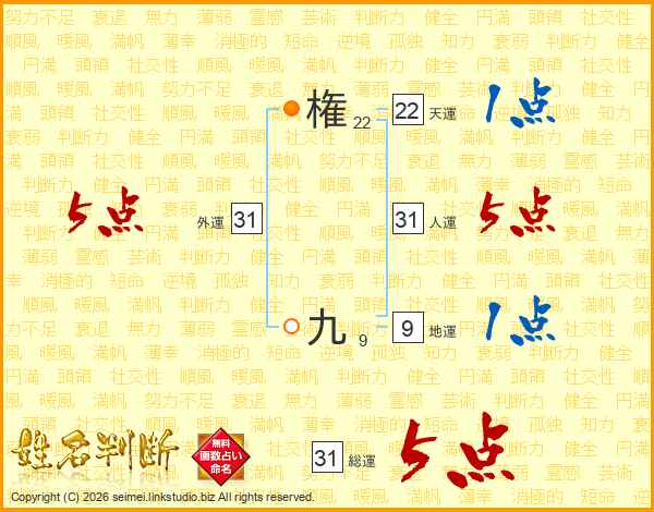 生活面を象徴する運勢です。外部から受ける影響力を表し、結婚運、家庭運や職場、環境への順応性を表します。総運から人運を引いた画数。姓や名が1文字の場合を除く。
