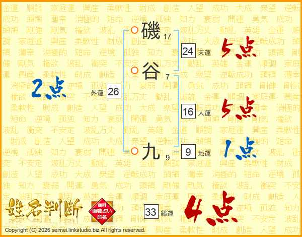 磯谷九さんの総運は33画の4点!