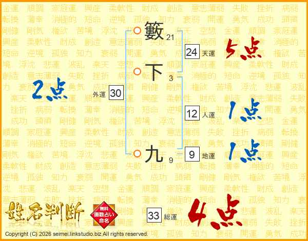 生活面を象徴する運勢です。外部から受ける影響力を表し、結婚運、家庭運や職場、環境への順応性を表します。総運から人運を引いた画数。姓や名が1文字の場合を除く。