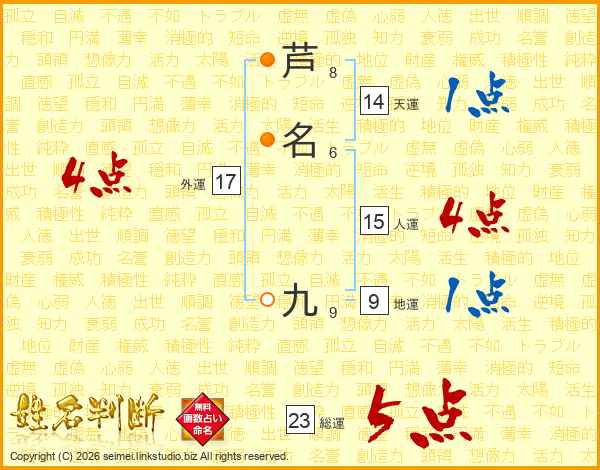 生活面を象徴する運勢です。外部から受ける影響力を表し、結婚運、家庭運や職場、環境への順応性を表します。総運から人運を引いた画数。姓や名が1文字の場合を除く。