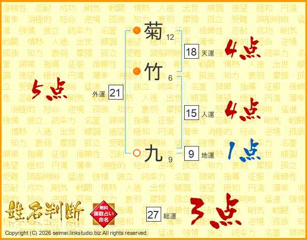 あなたの人生を表す1番重要な運勢です。生涯を通じて影響する総合運となり、主に50歳以降の晩年期に影響を及ぼします。苗字と名前の合計画数。