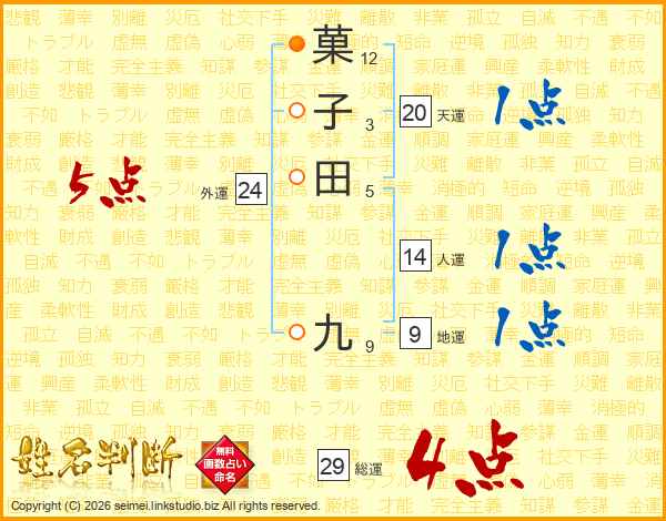 菓子田九さんの総運は29画の4点!