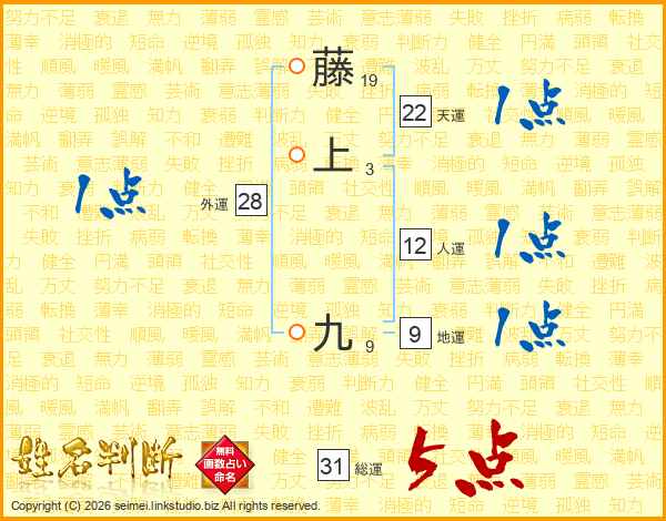 生活面を象徴する運勢です。外部から受ける影響力を表し、結婚運、家庭運や職場、環境への順応性を表します。総運から人運を引いた画数。姓や名が1文字の場合を除く。