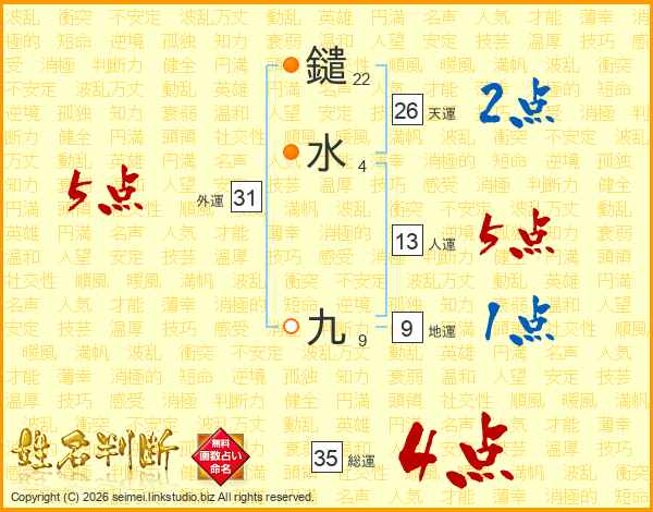 生活面を象徴する運勢です。外部から受ける影響力を表し、結婚運、家庭運や職場、環境への順応性を表します。総運から人運を引いた画数。姓や名が1文字の場合を除く。