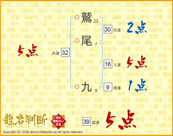 鷲尾九さんの総運は39画の5点!