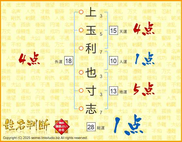 上(3画)玉(5画)利(7画) 也(3画)寸(3画)志(7画)