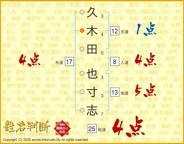 久(3画)木(4画)田(5画) 也(3画)寸(3画)志(7画)