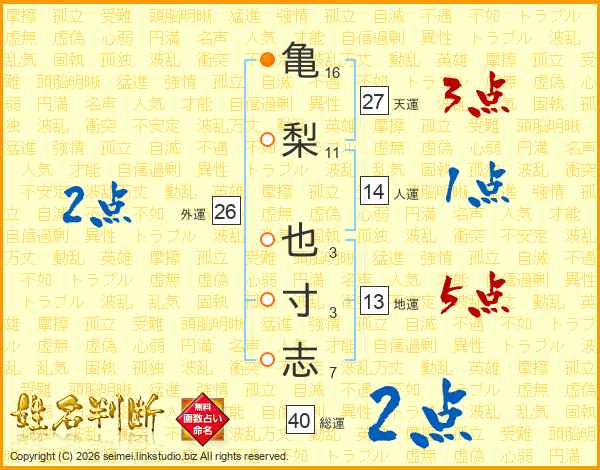 亀(16画)梨(11画) 也(3画)寸(3画)志(7画)