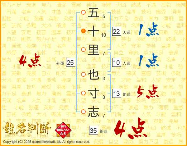 五(5画)十(10画)里(7画) 也(3画)寸(3画)志(7画)