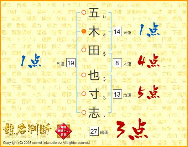 五(5画)木(4画)田(5画) 也(3画)寸(3画)志(7画)