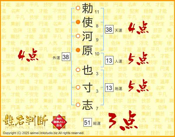 勅使河原也寸志さんの天運は38画の4点!