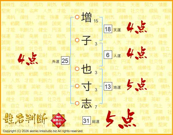 増(15画)子(3画) 也(3画)寸(3画)志(7画)