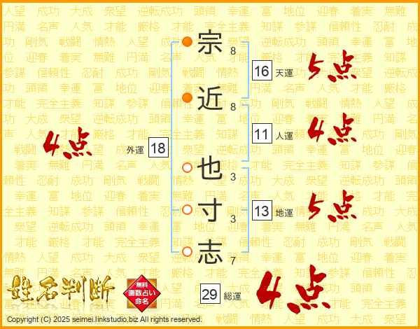 宗(8画)近(8画) 也(3画)寸(3画)志(7画)