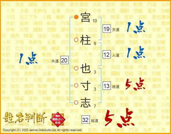 宮(10画)柱(9画) 也(3画)寸(3画)志(7画)