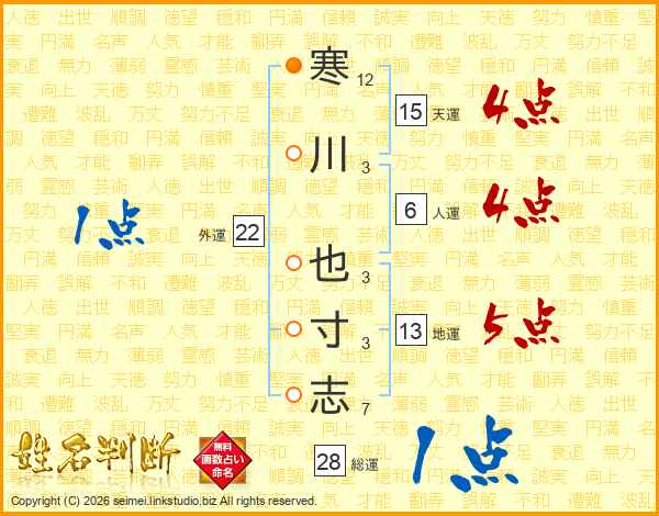 寒(12画)川(3画) 也(3画)寸(3画)志(7画)