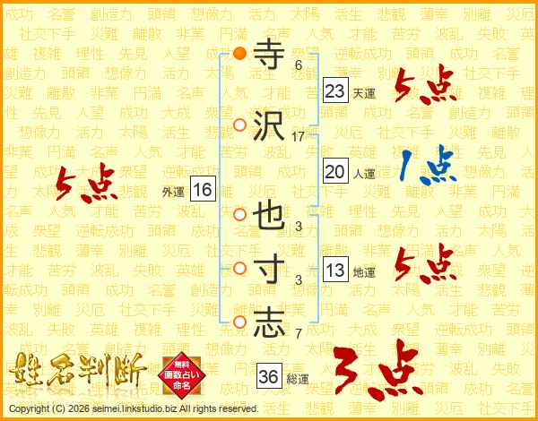 寺沢也寸志さんの地運は13画の5点!
