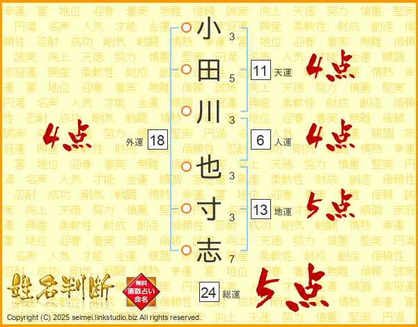 小(3画)田(5画)川(3画) 也(3画)寸(3画)志(7画)