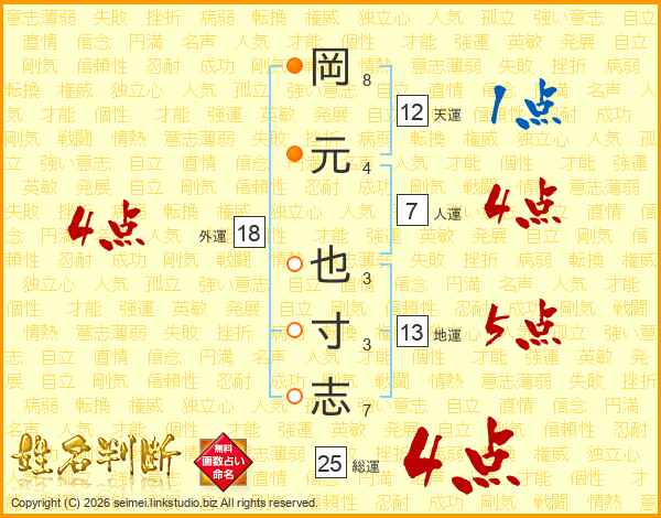 岡(8画)元(4画) 也(3画)寸(3画)志(7画)