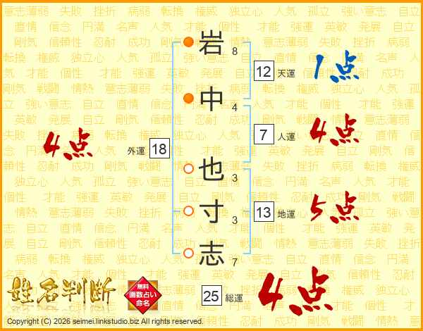 岩(8画)中(4画) 也(3画)寸(3画)志(7画)