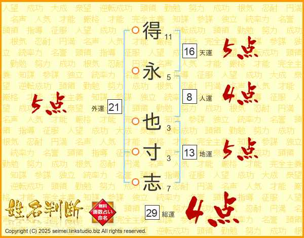 得(11画)永(5画) 也(3画)寸(3画)志(7画)