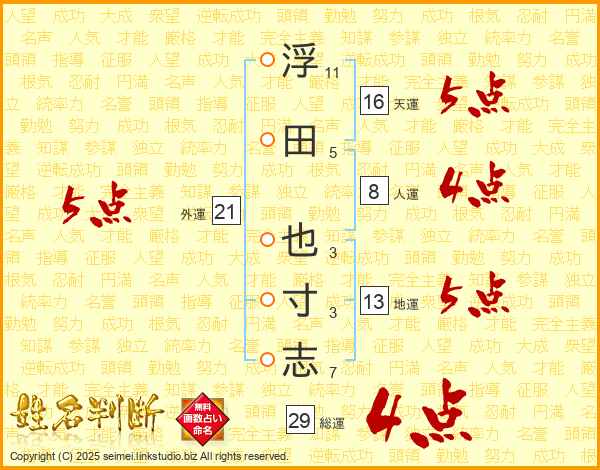 浮田也寸志さんの総運は29画の4点!