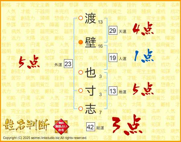 渡(13画)壁(16画) 也(3画)寸(3画)志(7画)