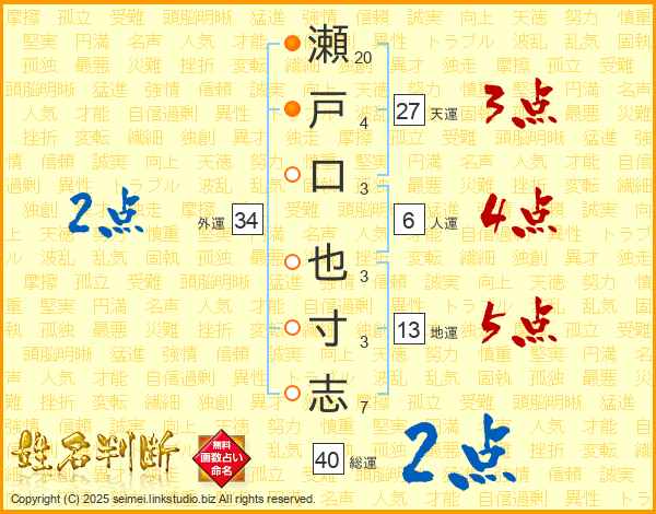 瀬(20画)戸(4画)口(3画) 也(3画)寸(3画)志(7画)