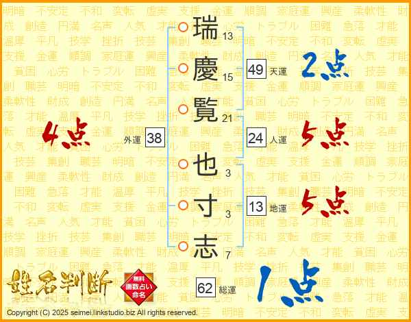 瑞(13画)慶(15画)覧(21画) 也(3画)寸(3画)志(7画)
