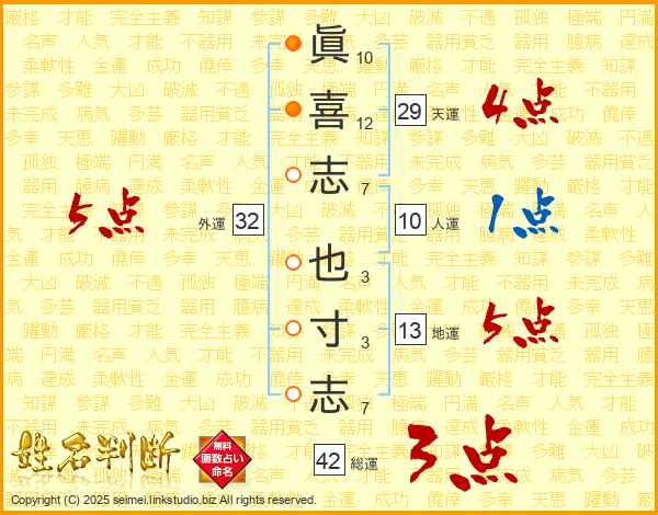 眞喜志也寸志さんの天運は29画の4点!