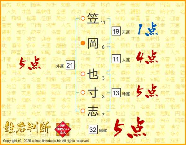 笠(11画)岡(8画) 也(3画)寸(3画)志(7画)