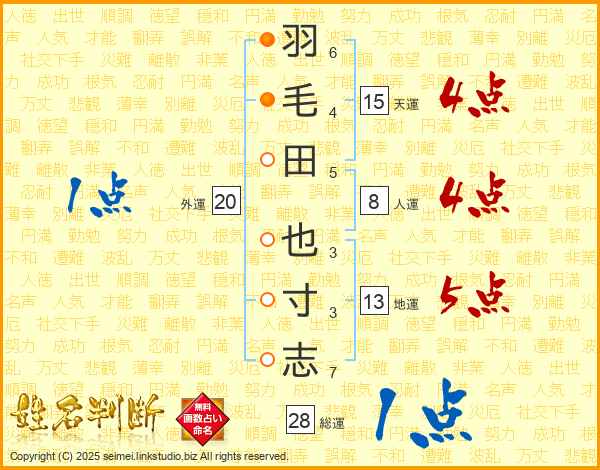 羽(6画)毛(4画)田(5画) 也(3画)寸(3画)志(7画)