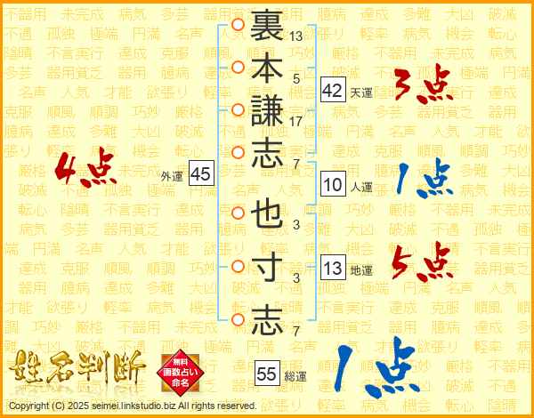 裏本謙志也寸志さんの総運は55画の1点!