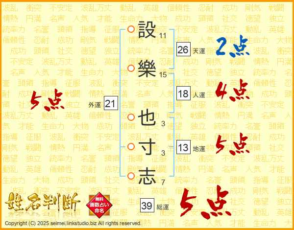設(11画)樂(15画) 也(3画)寸(3画)志(7画)