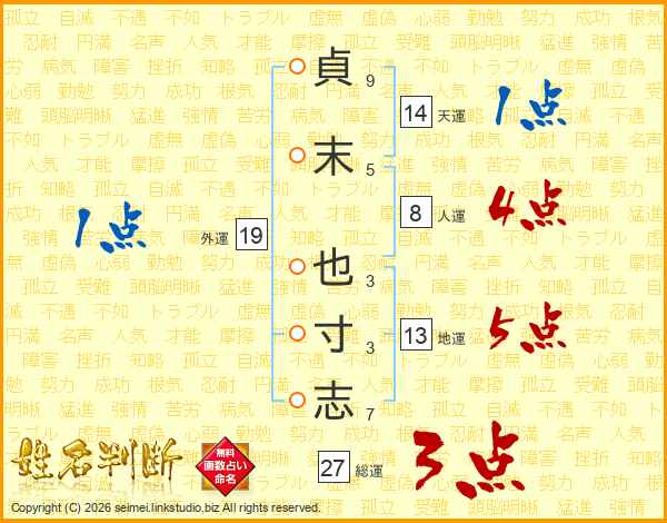 貞(9画)末(5画) 也(3画)寸(3画)志(7画)