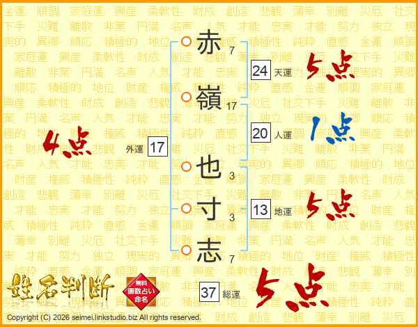 赤(7画)嶺(17画) 也(3画)寸(3画)志(7画)
