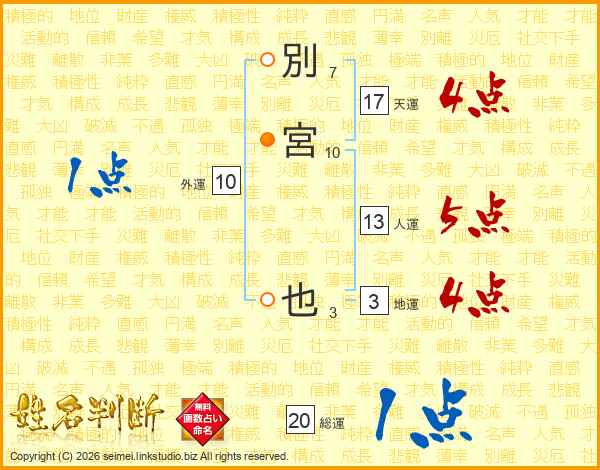 生活面を象徴する運勢です。外部から受ける影響力を表し、結婚運、家庭運や職場、環境への順応性を表します。総運から人運を引いた画数。姓や名が1文字の場合を除く。