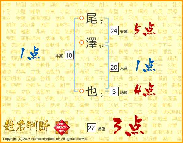 尾澤也さんの総運は27画の3点!