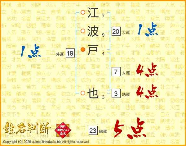 生活面を象徴する運勢です。外部から受ける影響力を表し、結婚運、家庭運や職場、環境への順応性を表します。総運から人運を引いた画数。姓や名が1文字の場合を除く。