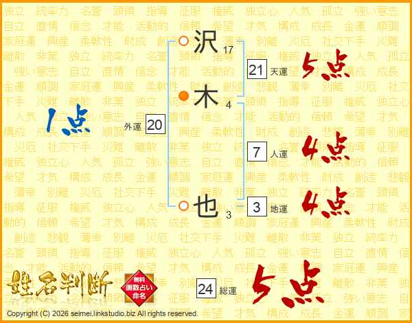 沢(17画)木(4画) 也(3画)