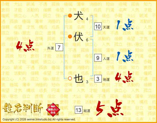 犬伏也さんの総運は13画の5点!