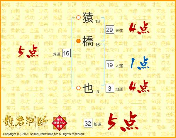 あなたの人生を表す1番重要な運勢です。生涯を通じて影響する総合運となり、主に50歳以降の晩年期に影響を及ぼします。苗字と名前の合計画数。