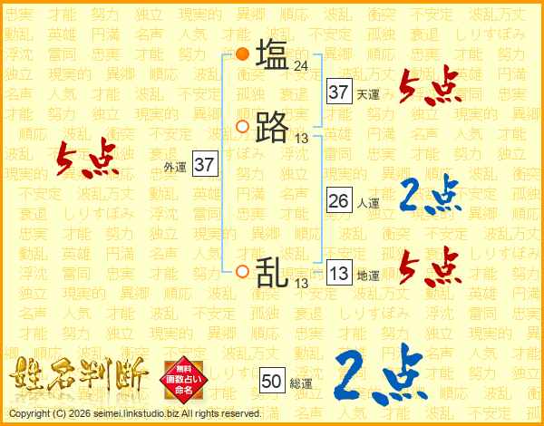生活面を象徴する運勢です。外部から受ける影響力を表し、結婚運、家庭運や職場、環境への順応性を表します。総運から人運を引いた画数。姓や名が1文字の場合を除く。