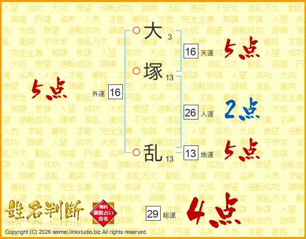 あなたの人生を表す1番重要な運勢です。生涯を通じて影響する総合運となり、主に50歳以降の晩年期に影響を及ぼします。苗字と名前の合計画数。