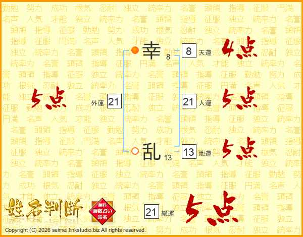 生活面を象徴する運勢です。外部から受ける影響力を表し、結婚運、家庭運や職場、環境への順応性を表します。総運から人運を引いた画数。姓や名が1文字の場合を除く。