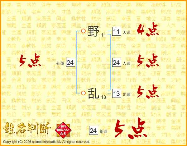 生活面を象徴する運勢です。外部から受ける影響力を表し、結婚運、家庭運や職場、環境への順応性を表します。総運から人運を引いた画数。姓や名が1文字の場合を除く。