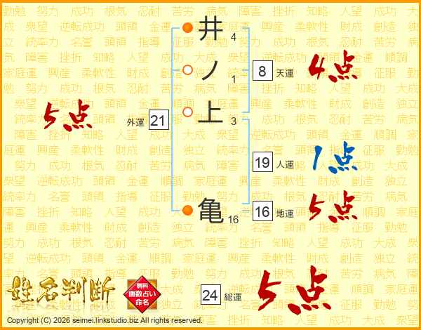 井(4画)ノ(1画)上(3画) 亀(16画)