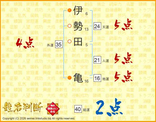 伊(6画)勢(13画)田(5画) 亀(16画)