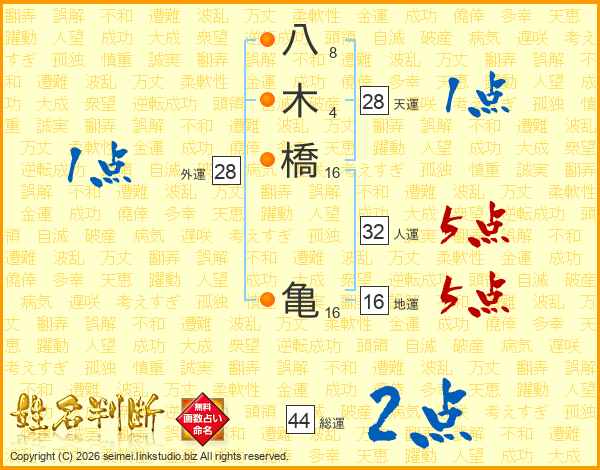 あなたの人生を表す1番重要な運勢です。生涯を通じて影響する総合運となり、主に50歳以降の晩年期に影響を及ぼします。苗字と名前の合計画数。