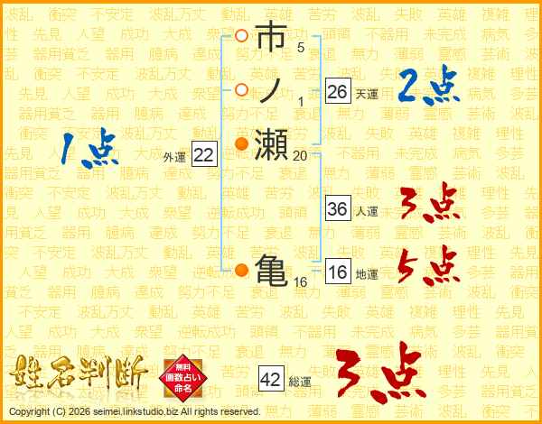 市(5画)ノ(1画)瀬(20画) 亀(16画)